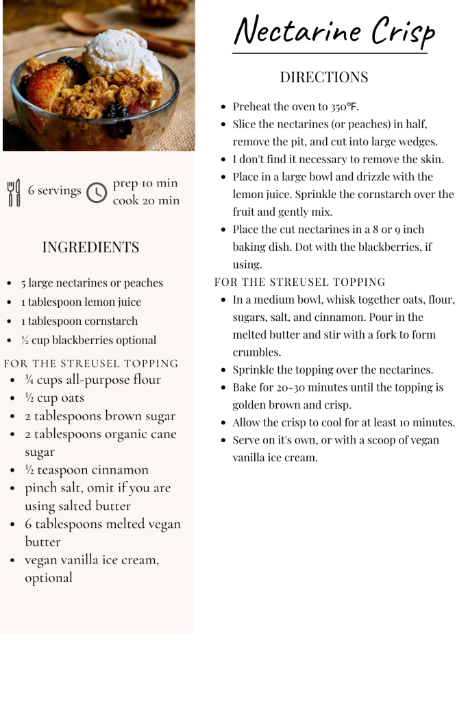 Nothing says summer like juicy and flavorful nectarines (or peaches), and this nectarine crisp is a total winner for a dessert when the fruit is at its ripest. It’s super easy to whip up and only takes about 10 minutes to get everything ready. The ripe, juicy fruit perfectly complements the crispy, oaty streusel on top. It’s seriously delicious on its own, but if you really want to take it up a notch, add a generous scoop of vegan ice cream on top and get ready to enter dessert heaven!