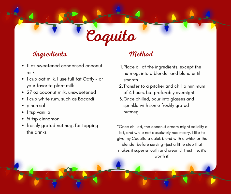 Festive, and luxuriously creamy, eggnog is possibly the quintessential holiday drink! Unfortunately, the thought of consuming a glass filled with heavy cream mixed with raw eggs might be off-putting to some, and store-bought eggnog just never quite hits the spot. Luckily, when I met CJ, whose mom hails from Puerto Rico, I was introduced to the amazing world of the Coquito, and I’ve never looked back!